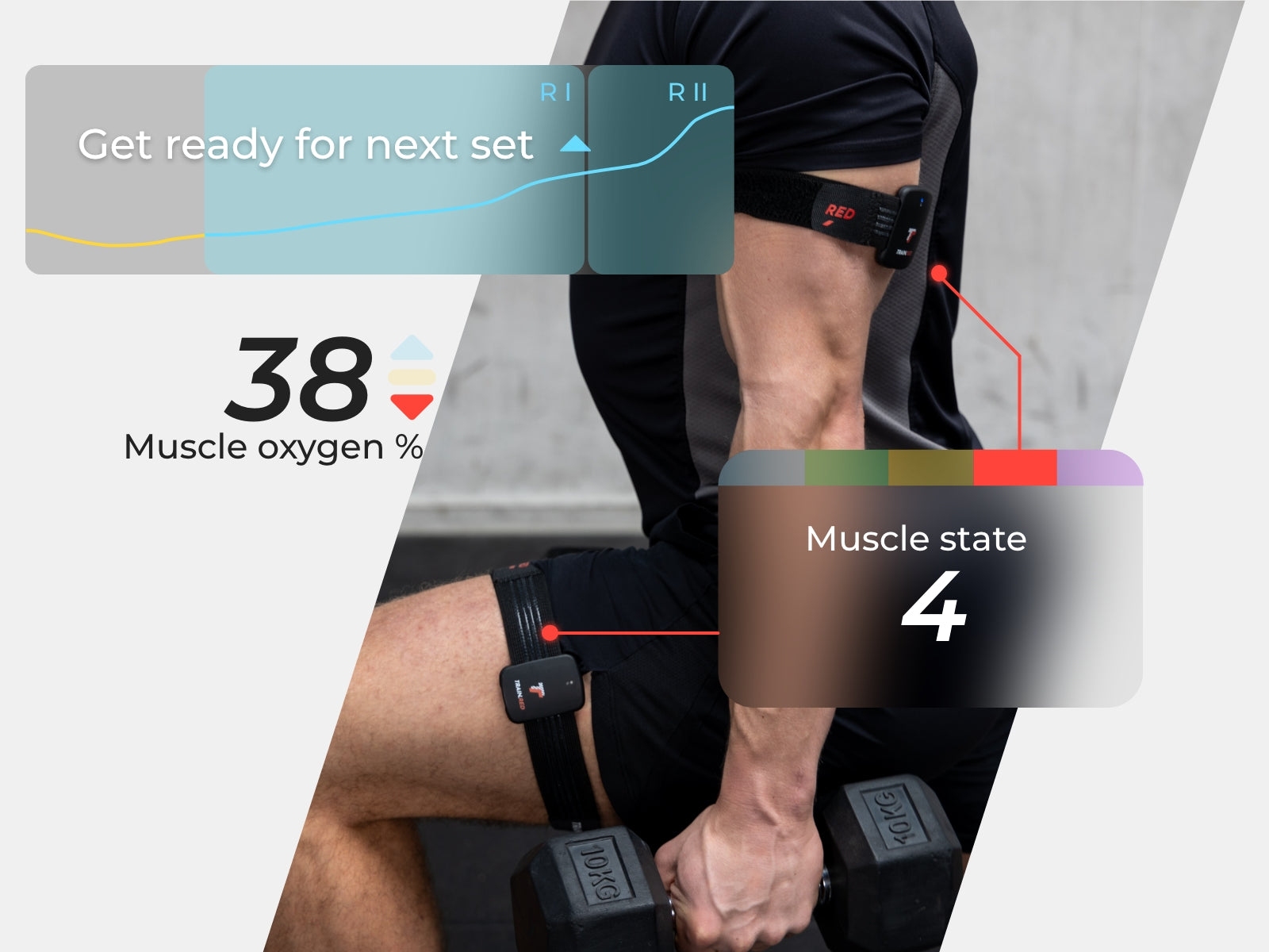 Starke Muskeln aufbauen mit Train.Red's Muscle States! Egal, ob Sie Ausdauer, größere Muskeln oder maximale Kraft wollen, sehen Sie die Echtzeitsignale Ihrer Muskeln in 5 einfachen Zuständen. Trainieren Sie im richtigen Tempo und wissen Sie genau, wann Sie den nächsten Satz beginnen sollten!
