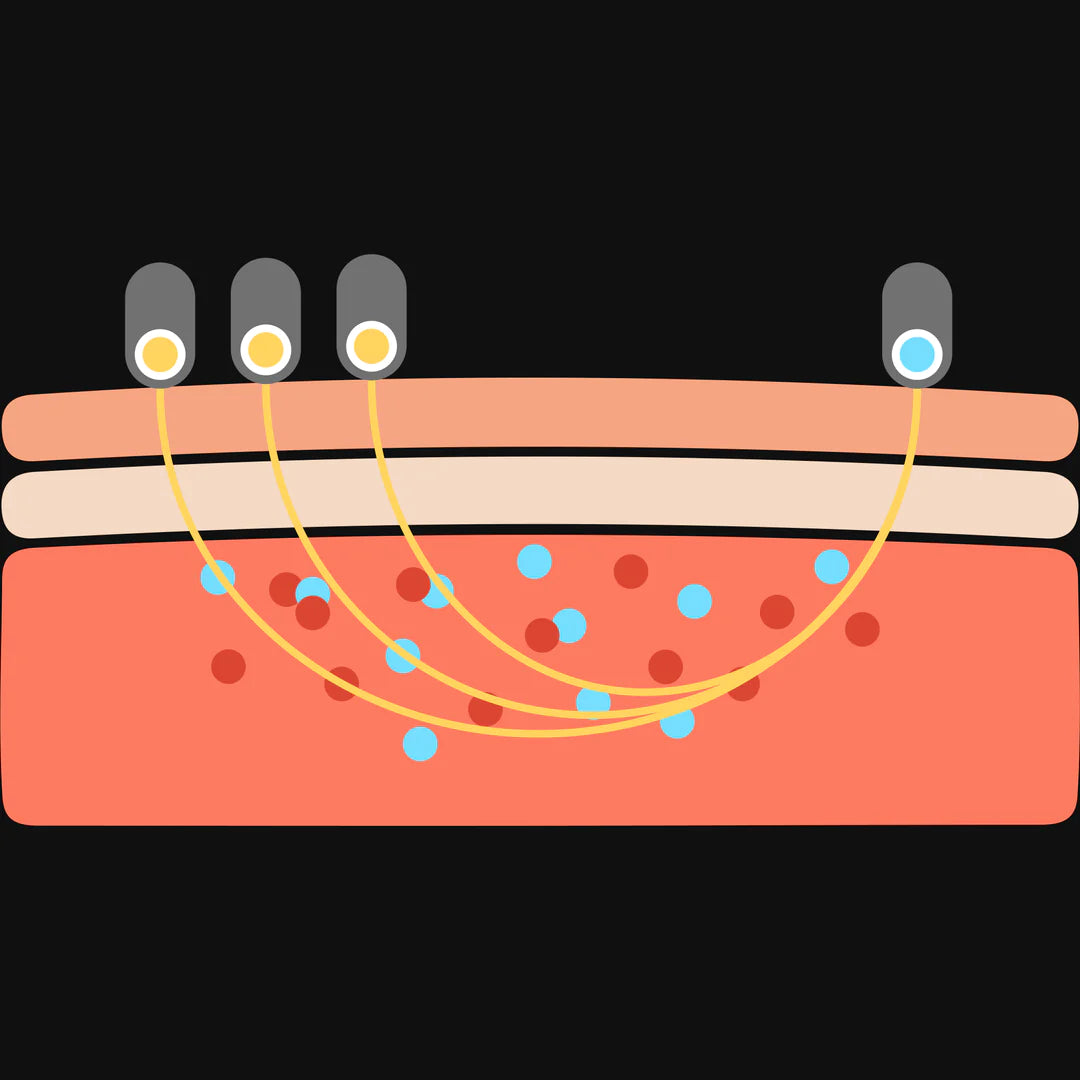 Diese Gleichung gilt für ein Medium mit einem Chromophor. Wenn mehrere Chromophore beteiligt sind, muss man mindestens so viele Wellenlängen messen, wie Chromophore vorhanden sind. Dies führt zu einer Reihe von linearen Gleichungen. Die Lösung dieses Satzes führt zu dem in den meisten NIRS-Systemen verwendeten Algorithmus. Mit einem Streumedium ist es möglich, die Absorption zu messen, wobei die Nahinfrarotquelle und der Detektor parallel zueinander angeordnet sind. Dies bietet die Möglichkeit, die Sauerstoffversorgung in größeren Geweben, z. B. Muskeln und Gehirn, mit NIRS-Geräten zu messen.